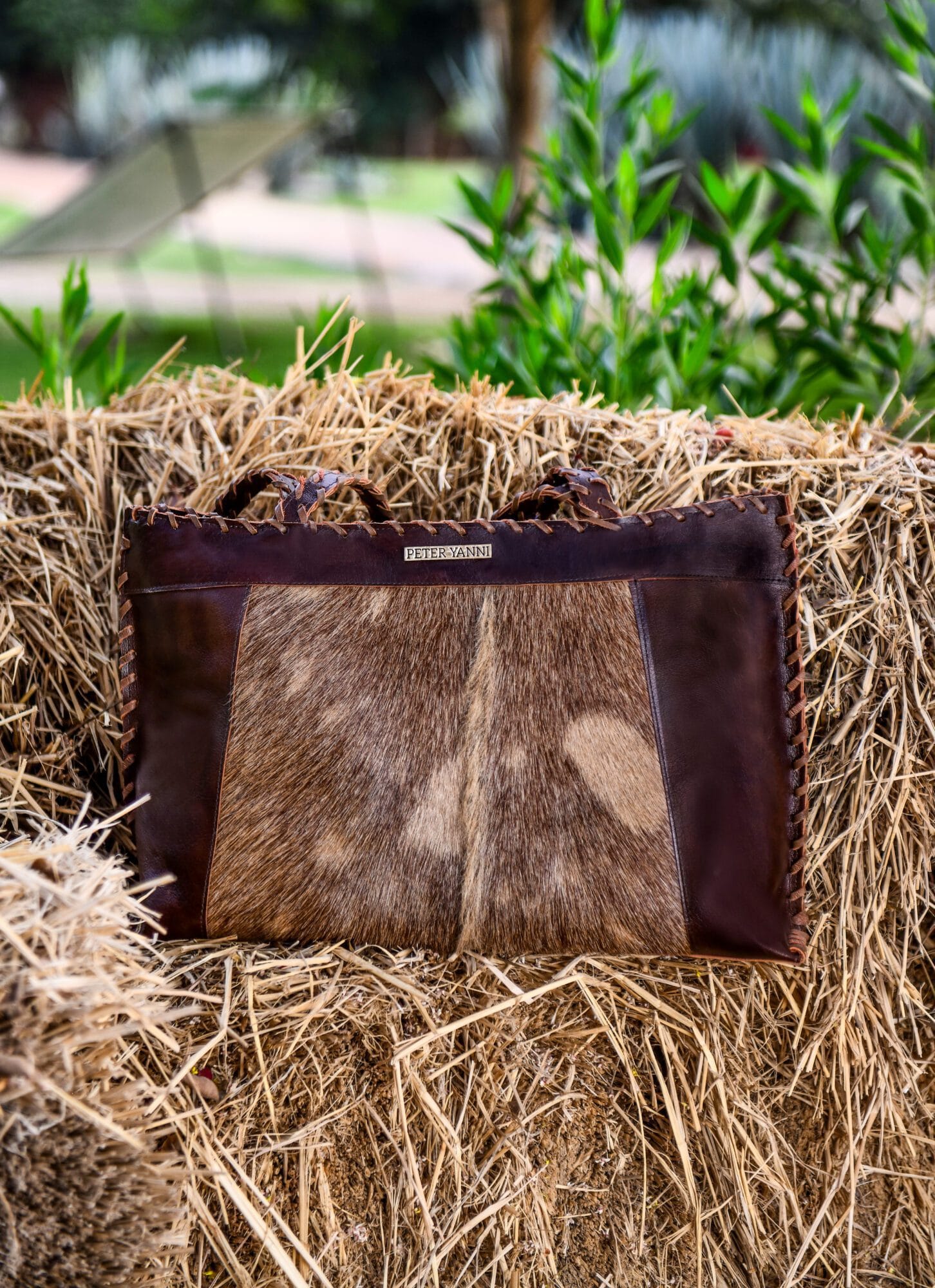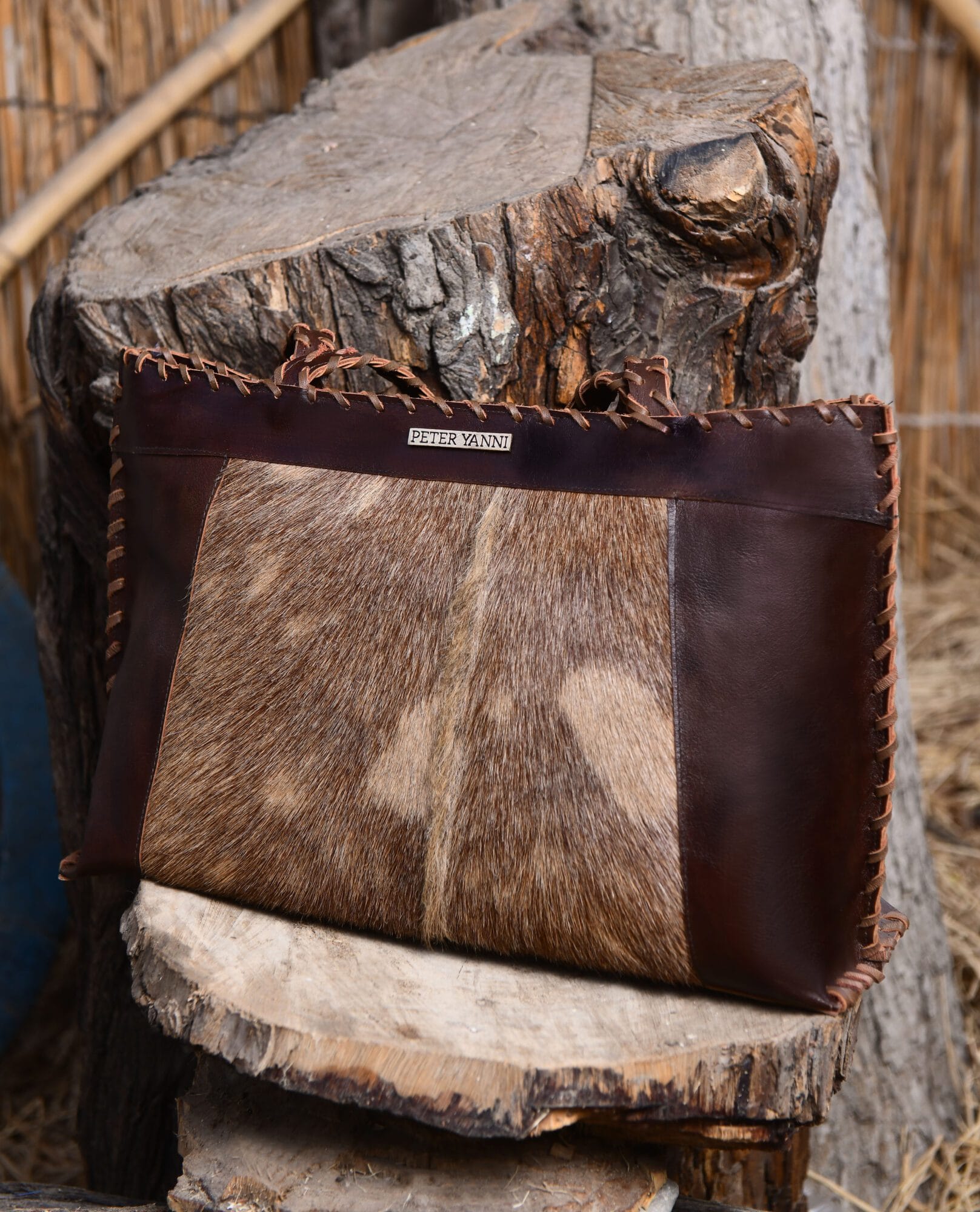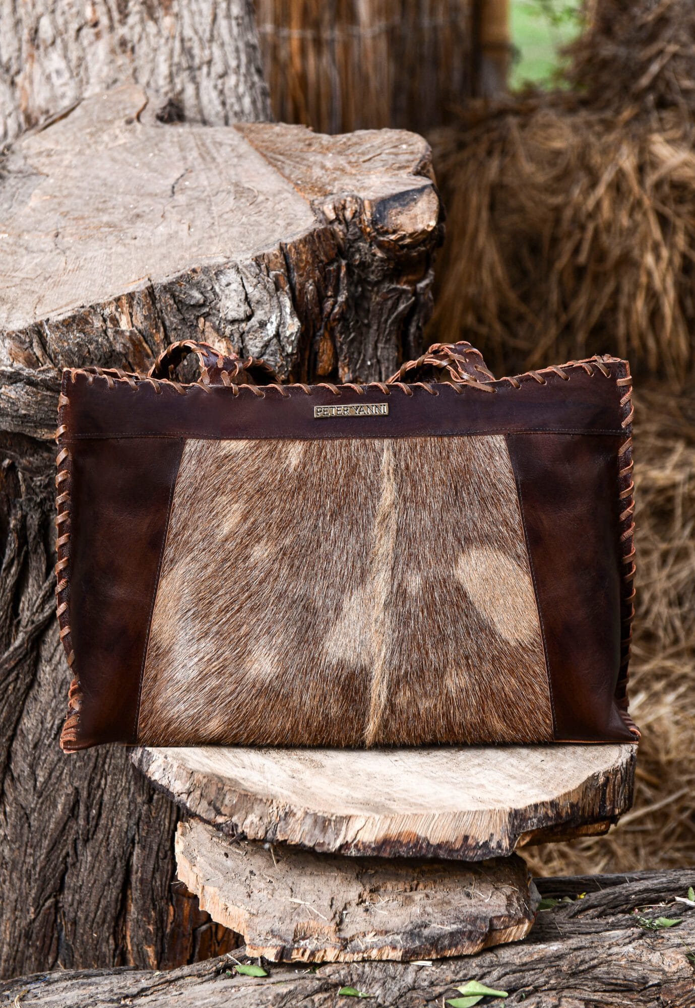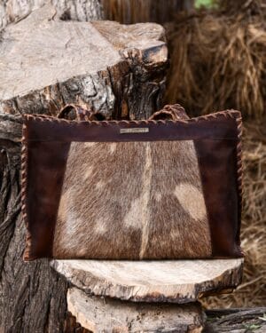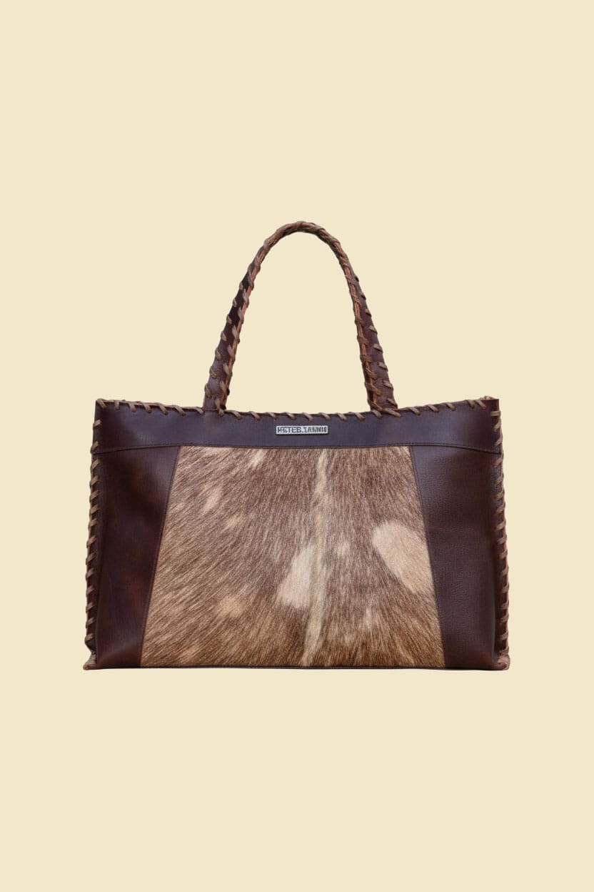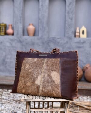 Featuring a rich brown leather frame with a natural ponyhair front panel, each bag has a unique pattern, making no two pieces exactly alike. The structured tote design offers spacious storage, making it ideal for daily use, work, or travel.