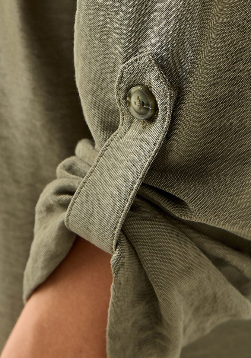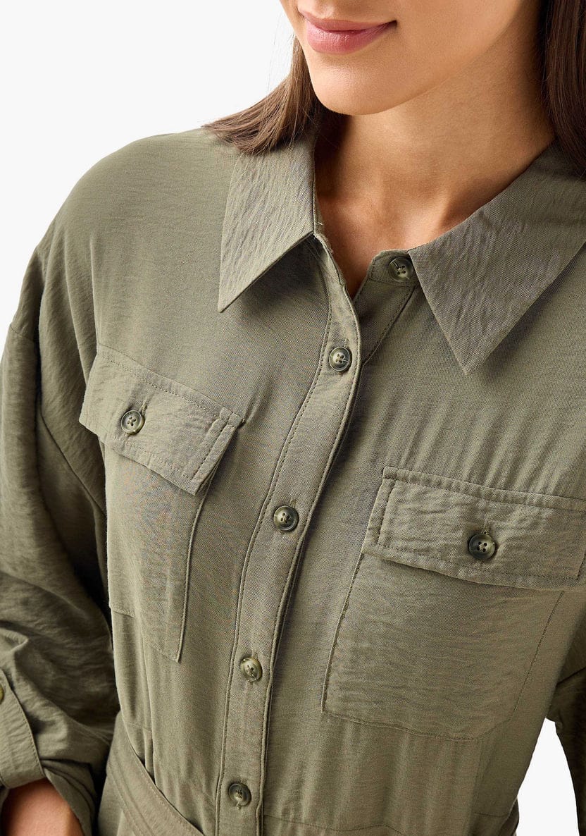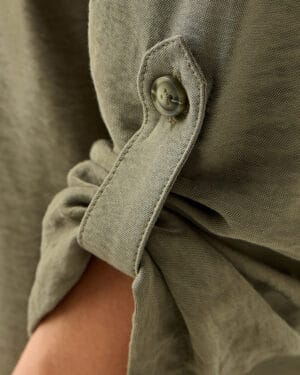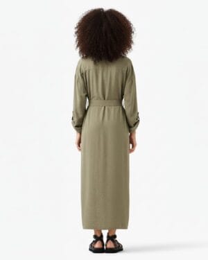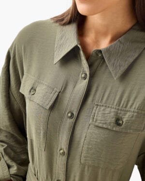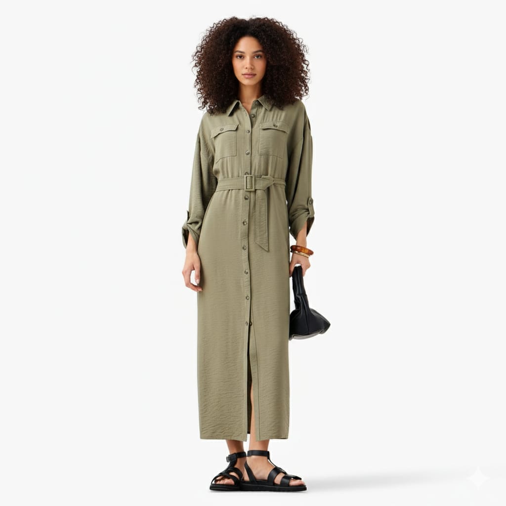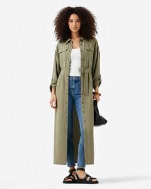 A clean, effortless longline shirt dress designed in a soft army-green shade. The utility details—front pockets, button-down closure, and adjustable sleeves—give it a confident, structured look without losing comfort.